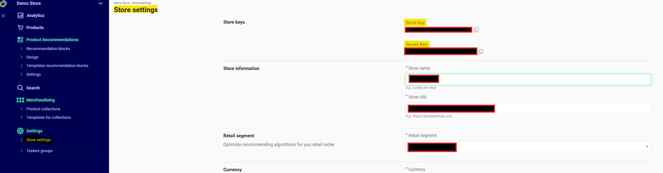 eehj3eu84299kg5ghw5a6743r8& Shop Secretpmd5362597thrgq8k256ep01t0- These can be found in Recommendations > Settings > Store settings in the Kameleoon app. You can also contact your Customer Success Manager for the key.